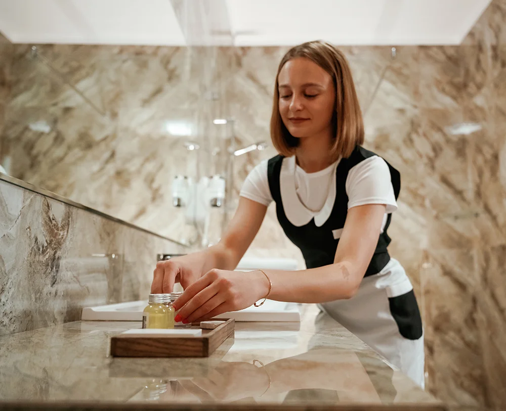 Neben der Reinigung kümmern wir uns zuverlässig um das Auffüllen von Toilettenpapier und Seifenspendern, sodass Ihre Gäste jederzeit gut versorgt sind. Gerne übernehmen wir auch die Auffüllung der Minibar, damit stets eine vollständige Auswahl an Getränken und Snacks zur Verfügung steht. Dies sorgt nicht nur für zufriedene Gäste, sondern entlastet auch Ihr Hotelpersonal.
